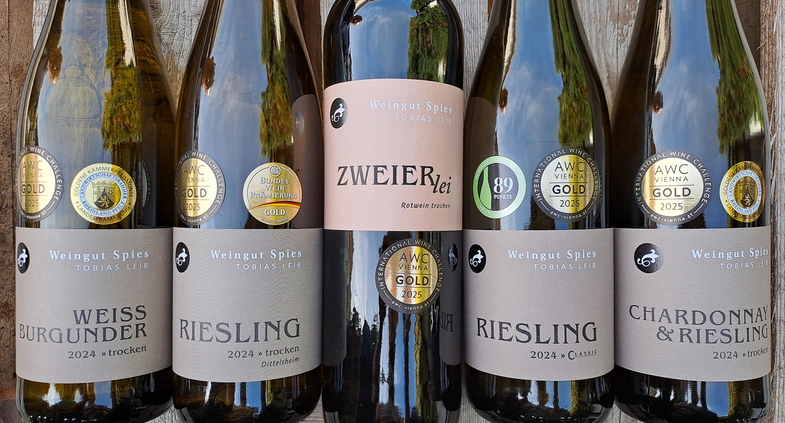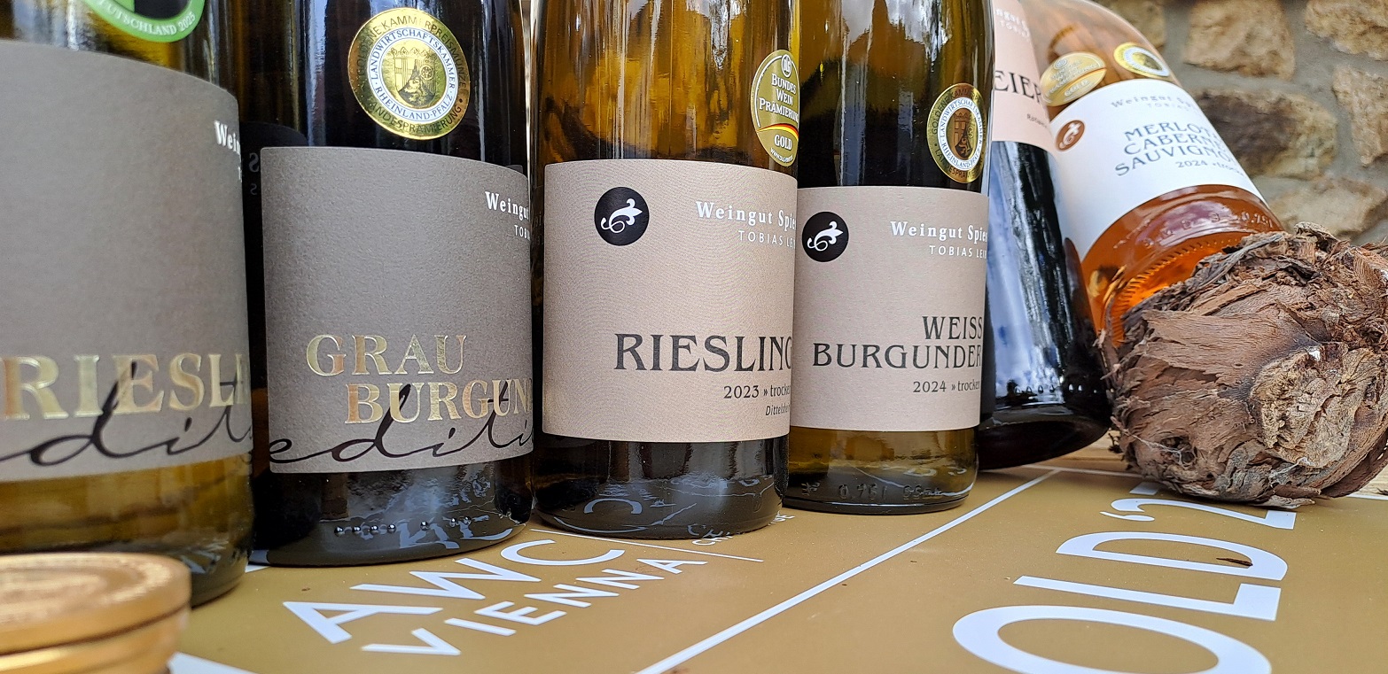 Largest officially recognized Wine Competition in the world AWC VIENNA: Goldmedaille für 2023 Silvaner trocken (ausverkauft), 2023 Chardonnay Spätlese trocken (19), 2021 Riesling Spätlese trocken edition (26a)